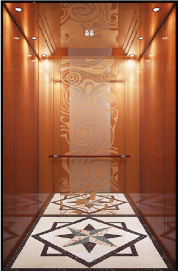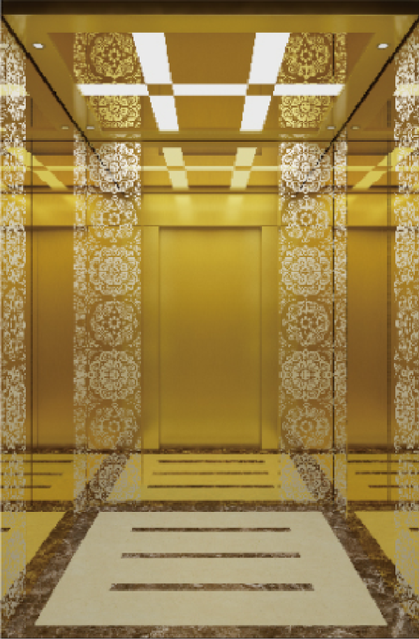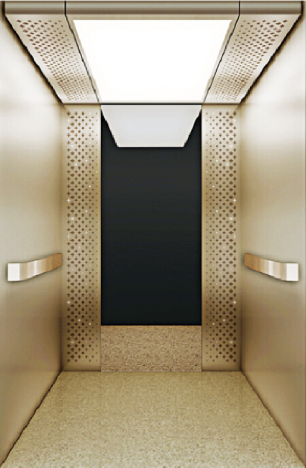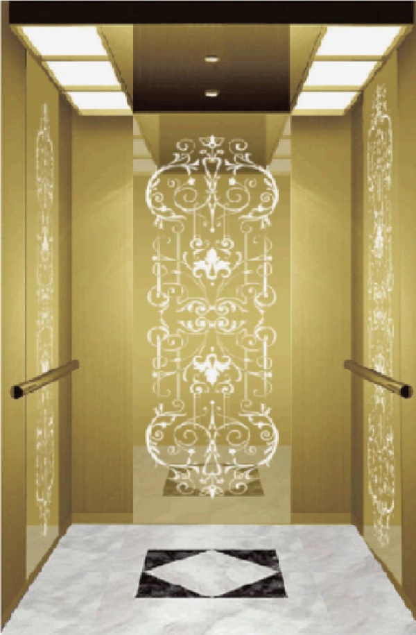 Cabin Side Wall: Stainless Steel Hairline Gold Mirror with etching finished. Cabin Rear Wall: Stainless Steel Hairline Gold Mirror with