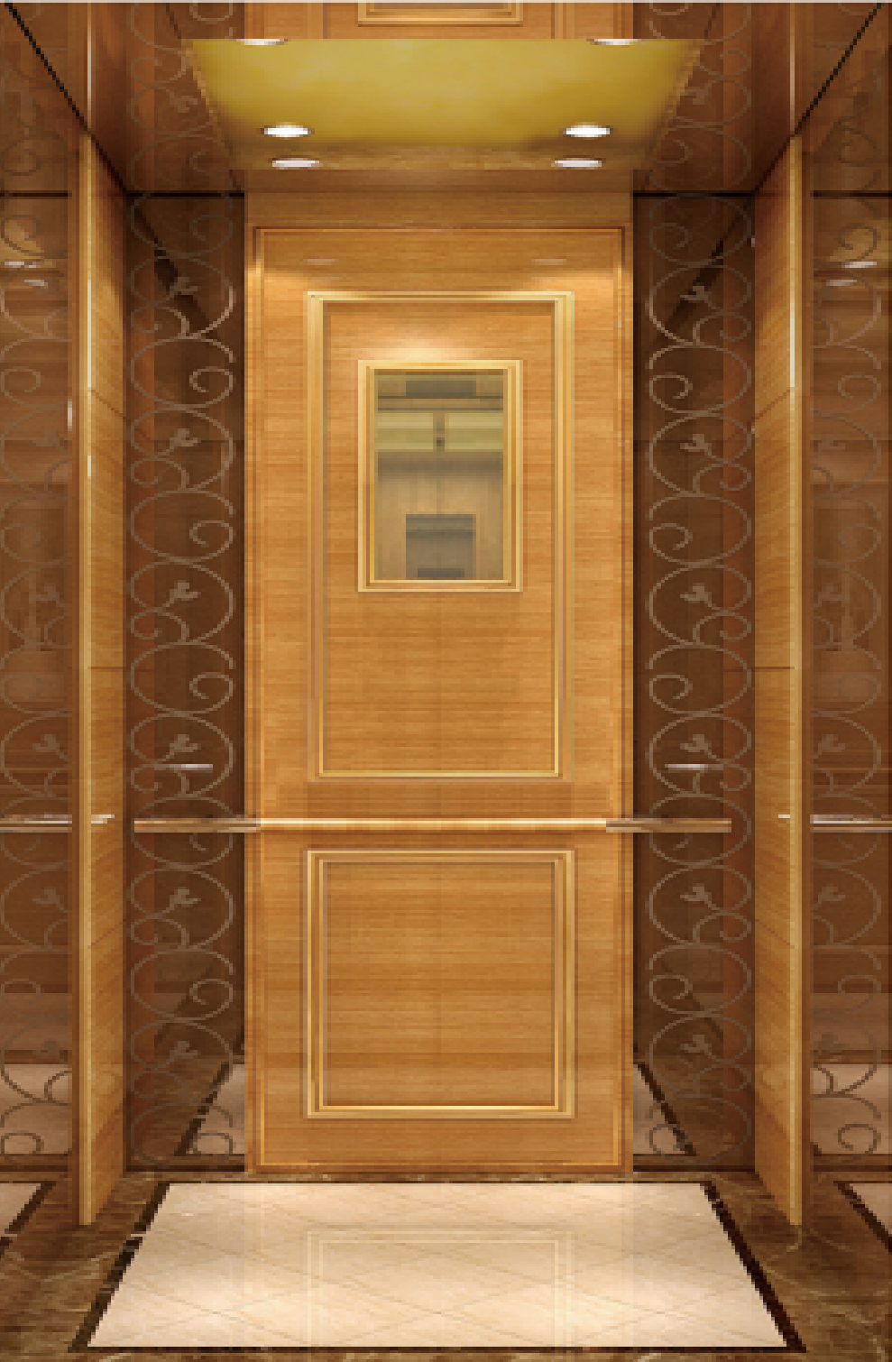 Cabin Side Wall: Mirror Etching Rose Gold Stainless Steel with Wood Facing. Cabin Rear Wall: Mirror Etching Rose Gold Stainless Steel with Wood Facing. Cabin Ceiling: Stainless Steel Mirror with LED lighting. Cabin Floor: Artificial Granite / Artificial Marble. Cabin Door : Stainless Steel Hairline. Landing Door: Stainless Steel Hairline.
